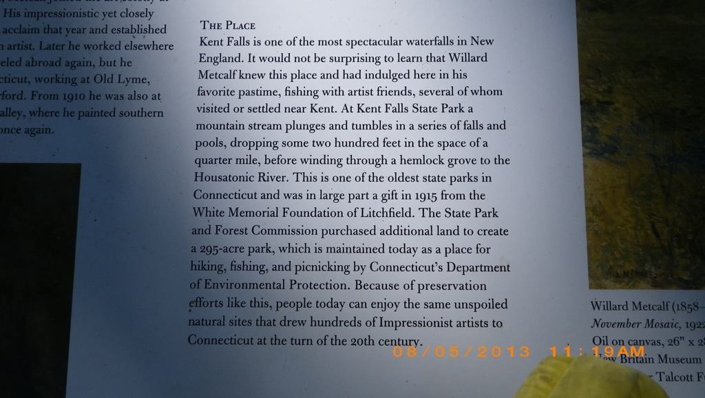 We woke at 630am and after showers, Chet fixed sausage patties and toast for breakfast. Today’s agenda was to drive to Kent Falls Park and hike the trail to see the falls. Chet and Carol use to come here often with their kids. This is a little part of a display that includes information about Kent Falls.