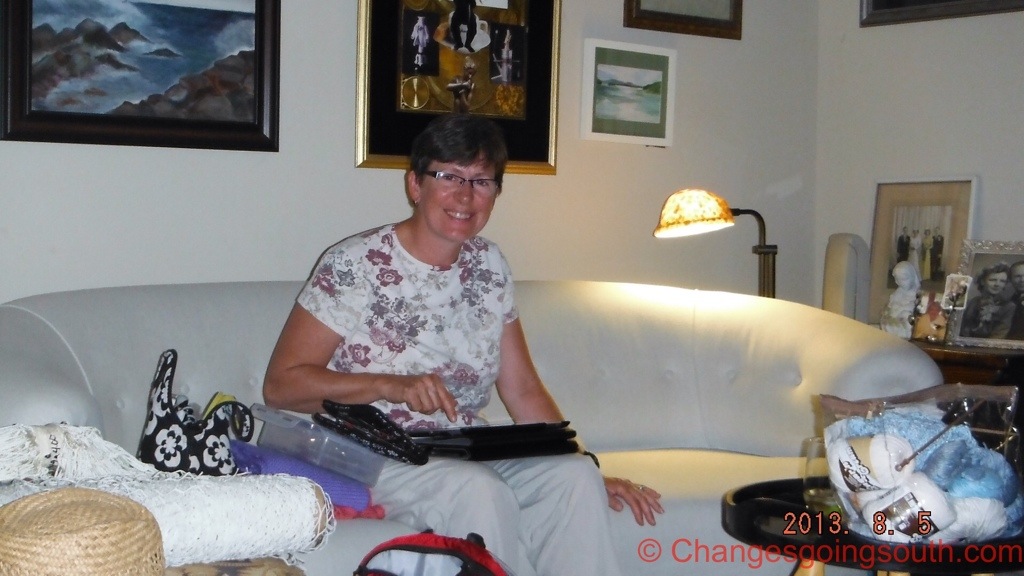 Later in the afternoon, we drove home to have sandwiches for lunch. Then Chet showed Phil his “Command Central” which is his Ham radio equipment in the basement and Carol showed me her knitting projects and yarn. This is Lorraine on their horsehair sofa.