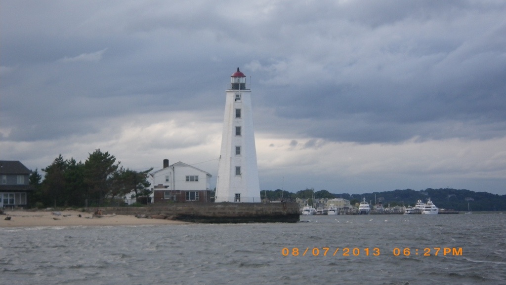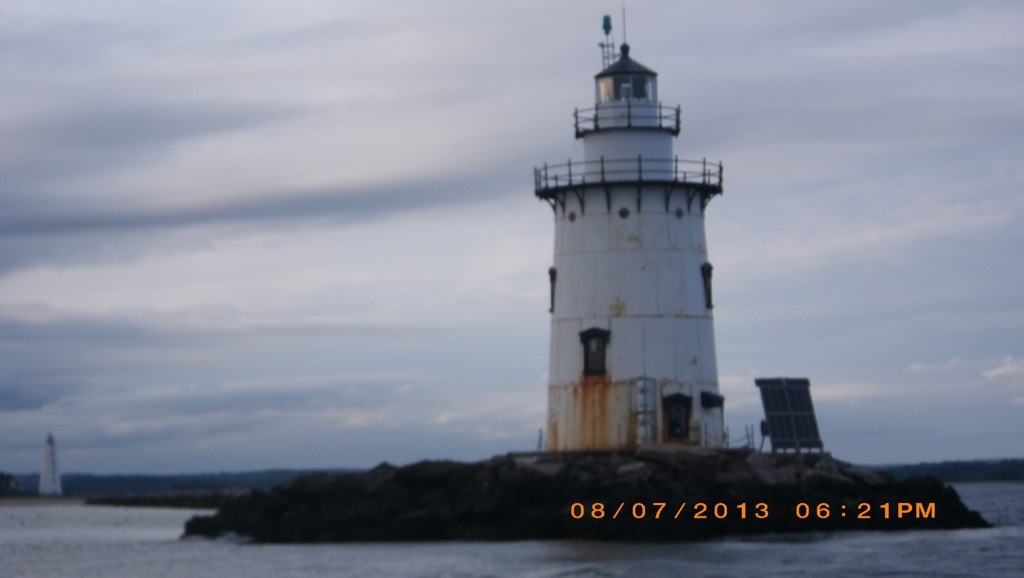 Mostly there were power boats and their wakes rocking us, but also sail boats motoring along, some with dinghies towed behind them. We had the rest of the rhubarb shortcake. The clouds were starting to fill in from the west so about 5pm, Lorraine suggested that we leave right now and go to Essex so that we didn’t have to travel in the rain. Phil agreed so we raised anchor at 517pm and motored off. Phil let out the head sail so that we could start to sail after we rounded the end of Menunketesuck Island. The winds had picked up with white caps and 2ft seas and we were heading up wind. We were able to sail for about 10 min until we couldn’t point high enough to clear the next point, so we had to turn on the iron monster. Lorraine was getting seasick, so took over the helm, which helped. About 645pm we entered the Connecticut River that had 2 lighthouses. One at the entrance to the channel.