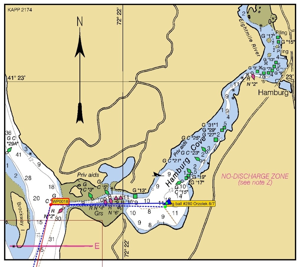 By this time it was about 715pm and as it was cloudy, getting darker. We had contacted Patty when we were about 2.5 nm from the channel, and spoke with her dad who said we would make it before dark, but it was taking us longer than we expected with a negative current all the way. Should we continue to the mooring ball in Hamburg Cove with great protection from the coming weather or anchor across from Essex which is more exposed? Would we be able to see to pick up the mooring ball? We got to Essex at about sunset, and decided to continue on as the iNavX charting software said we’d get there by 810pm. Lorraine is still at the helm as we see the red and green buoys marking the narrow twisty channel into Hamburg Cove. It is definitely getting darker and difficult to see the buoys. We both missed seeing one pair of buoys and we went aground! Phil took over the helm and we managed to wiggle off to head in the right direction. This time Lorraine stood by the mast to look ahead and after 2 more sets of buoys we were in deeper water. Now to find the right buoy. We motored in the direction Patty had talked about, and as the light was fading at 818pm, I spotted RZOLE (part of Orzolek) on a mooring ball and thought that’s it! They had an easy to catch little ball to the loop of line and we were tied up in no time. 5 min later it was too dark to see the markings on the mooring balls. RELIEF! We could tell that it was a beautiful place and very protected as we were told. I texted Patty that we made it and Phil had his cold one (beer). We relaxed outside until the bugs drove us in and we did our typical evening activities.