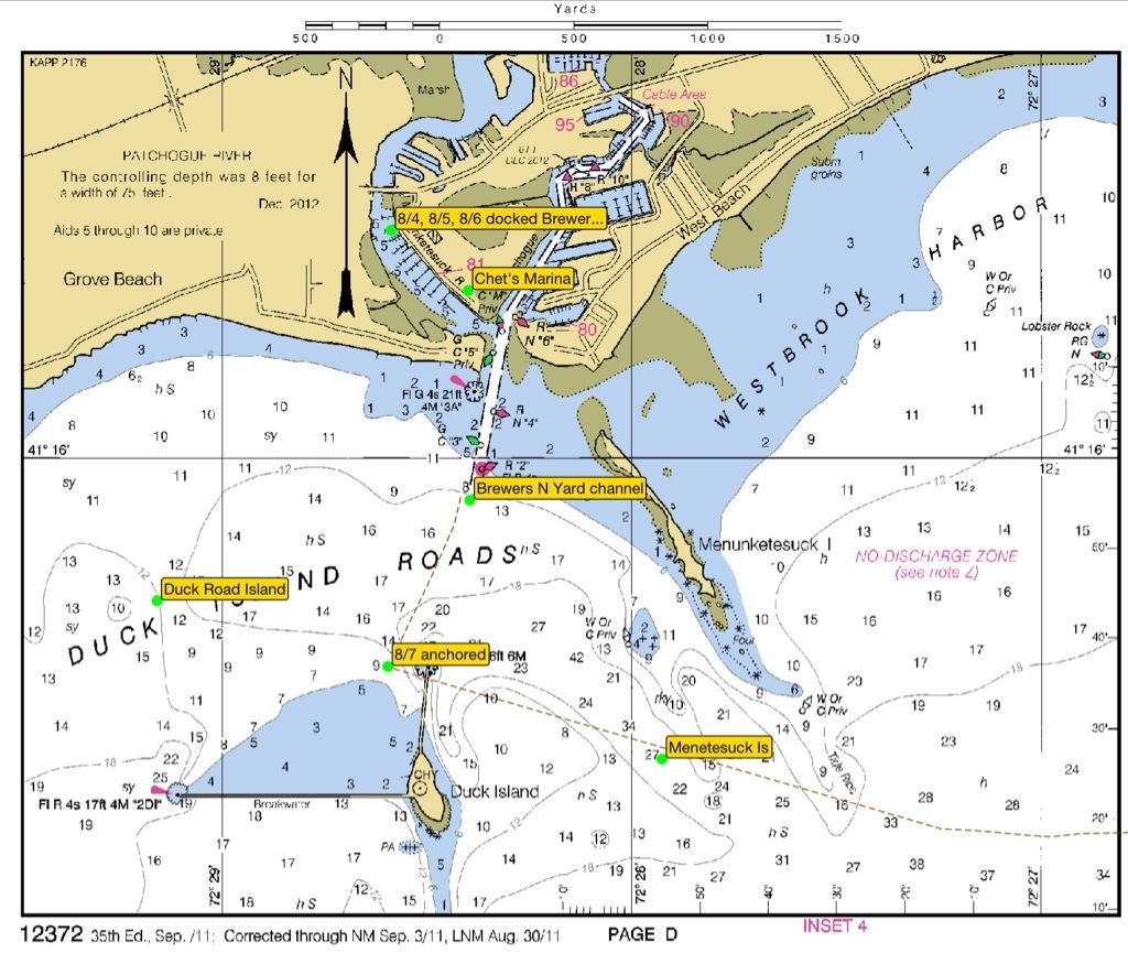 We left the marina in Westbrook about 45 minutes after you did on Wednesday, and went out into LIS to sail a little and we circled Duck Island before coming back into the Roads to anchor. We did not see any activity topside on your boat so did not want to disturb your R&R. After you left, we stayed anchored out to watch the evening races plus then overnight, figuring even if the rain did come in the morning we only had a 20 minute trip back in, and the winds were not predicted to be too high. Scattered showers did come overnight and early the next morning (Thurs) but cleared out and the rest of Thursday was balmy. We went back in to our slip at high tide around 12:30, had a nice local lunch, and then packed to come back home.