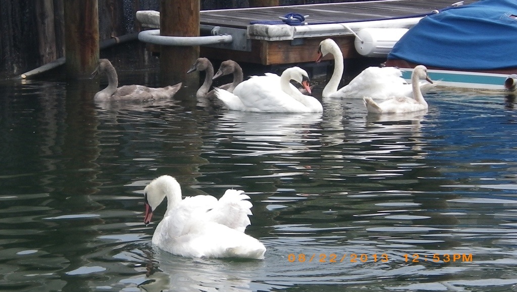 After the rain stopped about 130pm, a family of swans came down our finger of the marina [3 adults and 4 signets (the babies which were half as big as the adults)] swimming around and behaving in a way I’ve never seen before. It was very interesting as the adults were making a lot of noise, and one had an aggressive posture, head down, wings arched up, paddling as fast as he could and was chasing after the other one.