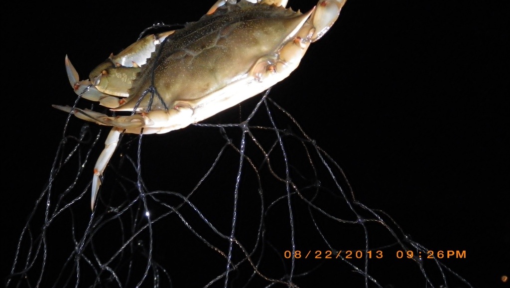I fixed Cajun Chicken Pasta for supper and convinced Phil (long suffering on this topic) to come crabbing at night. You shine a light in the water, the crabs are supposed to be mesmerized by the light and come to the light ready to be scooped into the net. We went to a park with a bulkhead as recommended by the gentleman at the chandlery a short drive away. I shine a light in the water at the floating dock- nothing. We try a different place, still nothing. Lets try on the bulkhead, well we see a few crab after a while, but they are the small muddy looking crab. They do come very slowly closer to the light. We practice netting them and put them back in the water. The tide is rising, so that’s good. We see a little blue crab too small to net. Them we finally see a bigger blue crab and net him. Boy that one is 3 1/4″ long (has to be 5″ to keep) and has tangled himself in the net so bad that it takes both our efforts to get him off. Finally we toss him back into the water and that’s it for the night. Phil is done!