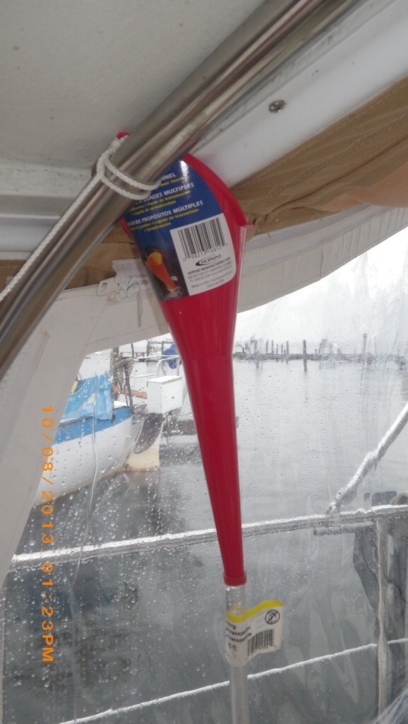 Wow! It’s hard to believe we have been gone 90 days. What a change from yesterday. The winds have continued to build and have clocked to come from the North which means it’s ALOT colder in the mid 60’s. It’s raining hard which started sometime in the middle of the night. I put on the side windows in the morningbut still have to work on water dripping in at the end of the track along the back of the Hard Dodger. I think and think how can we hang the funnels? I have an idea! Let use 1/8″ line through the hole in the funnel to tie it to the Dodger tubing. I have to get out the line in the sail locker which means getting half the items out so I can reach the blue tub we keep sewing/canvas items in so I can get to the line for the Honda Generator Covers to be made. Isn’t that the way of it on a boat? That done, Phil is happy to rig up the funnels, attach the clear tubing and IT WORKS!