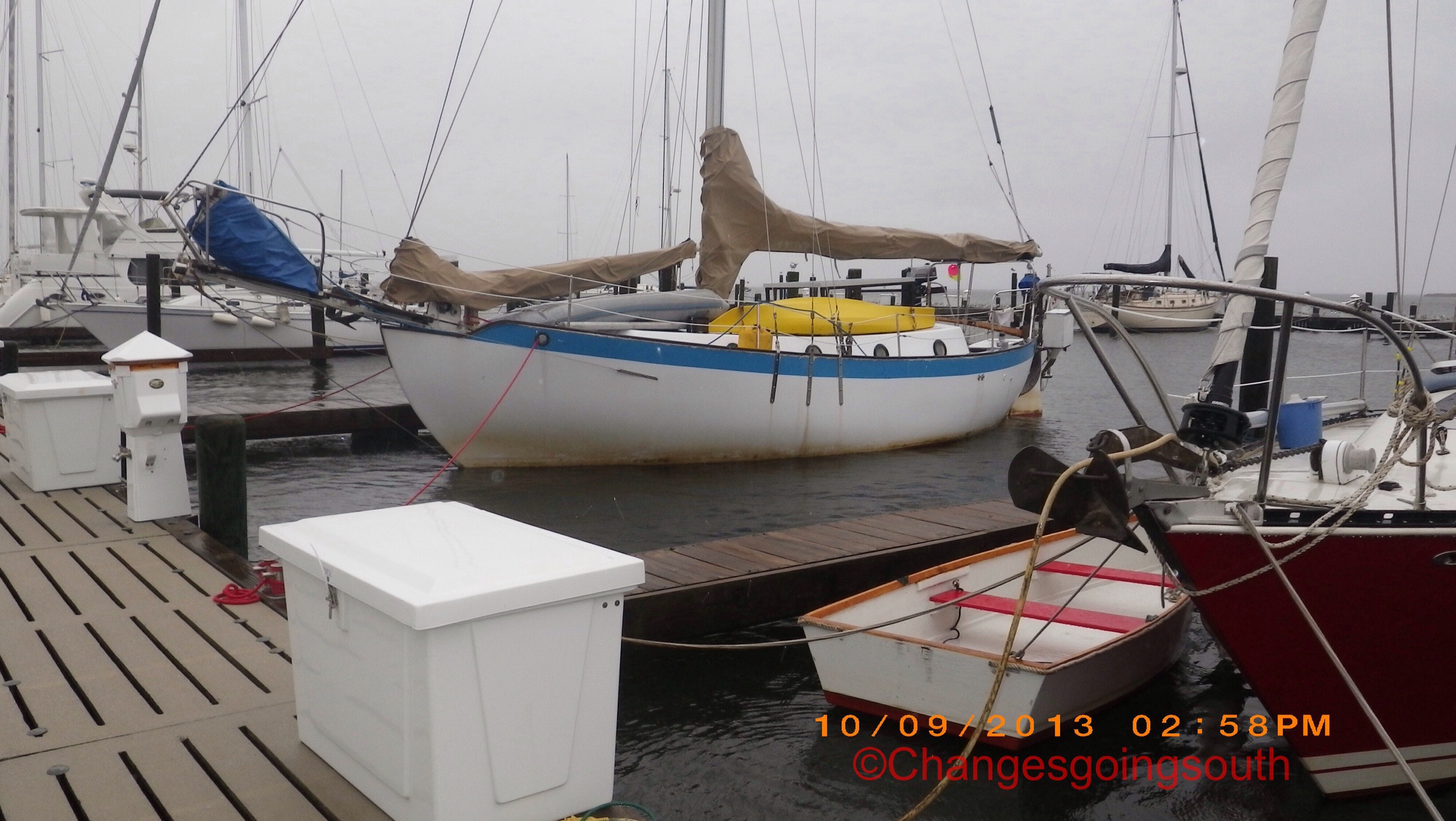 The above photos were captured when the water was at it’s highest. A little later the water went down 4-6″. With all the rain, Phil emptied the dinghy which had 4-5″ of water just from rain since yesterday! Here are photos of Changes and Rode Trip with the water already staring to recede a little.
