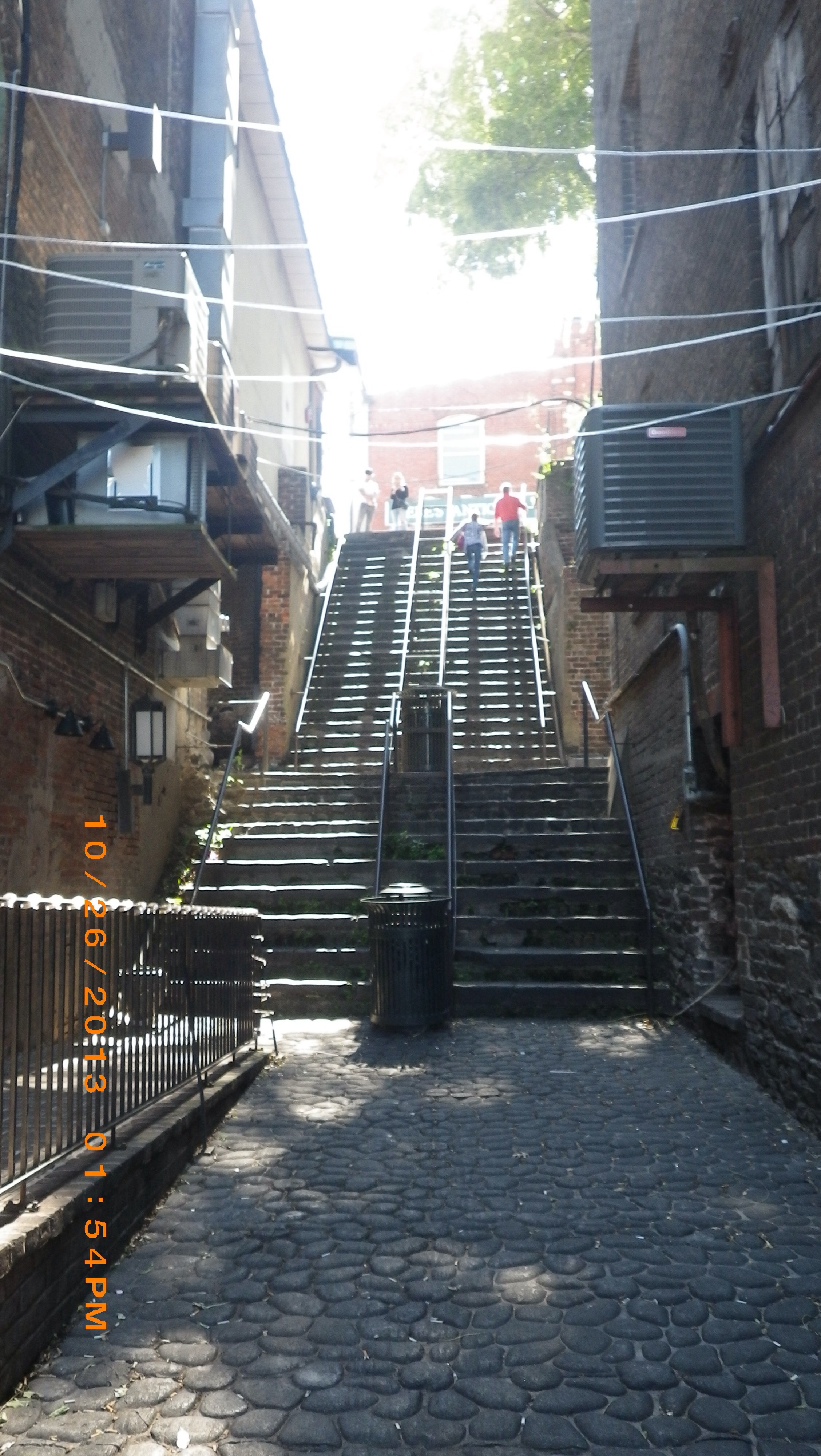 Looking at a map of the Historic district of Savannah, it looks like it would be big, but we found that the squares are small and every other street parallel with the river are like alleys that are at the back of the buildings and the main streets are along the front of the buildings, so it doesn’t take long at all to move from one square to another and get to the riverfront. Before we got to the riverfront, we walked to a yarn shop to get a pair of knitting needles to replace a set of bamboo ones that broke in the quarter berth. I have a work in progress so was glad to find a pair. Phil was glad that I didn’t buy any yarn!Savannah by the river sits on a bluff, so periodically along Bay Street there are steps to get down to the River front.