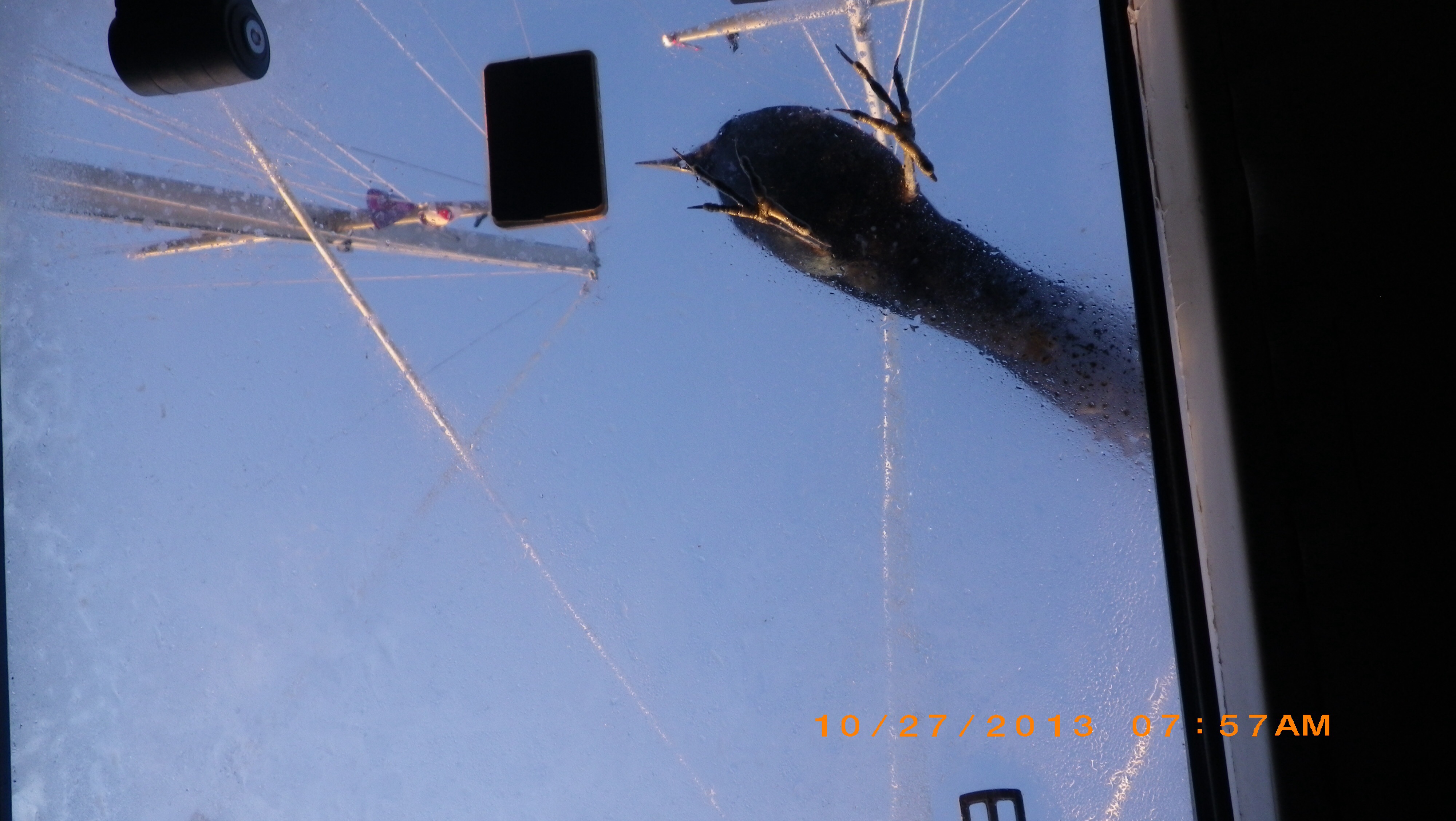 We woke up to more cold this morning. An unusual thing happened. We heard birds walking on the foredeck and then saw birds walking on the forehatch. We haven’t seen this before so I attempted to get some photos, very quietly getting out of bed to get the camera and not disturb the birds. This is my not very good results.