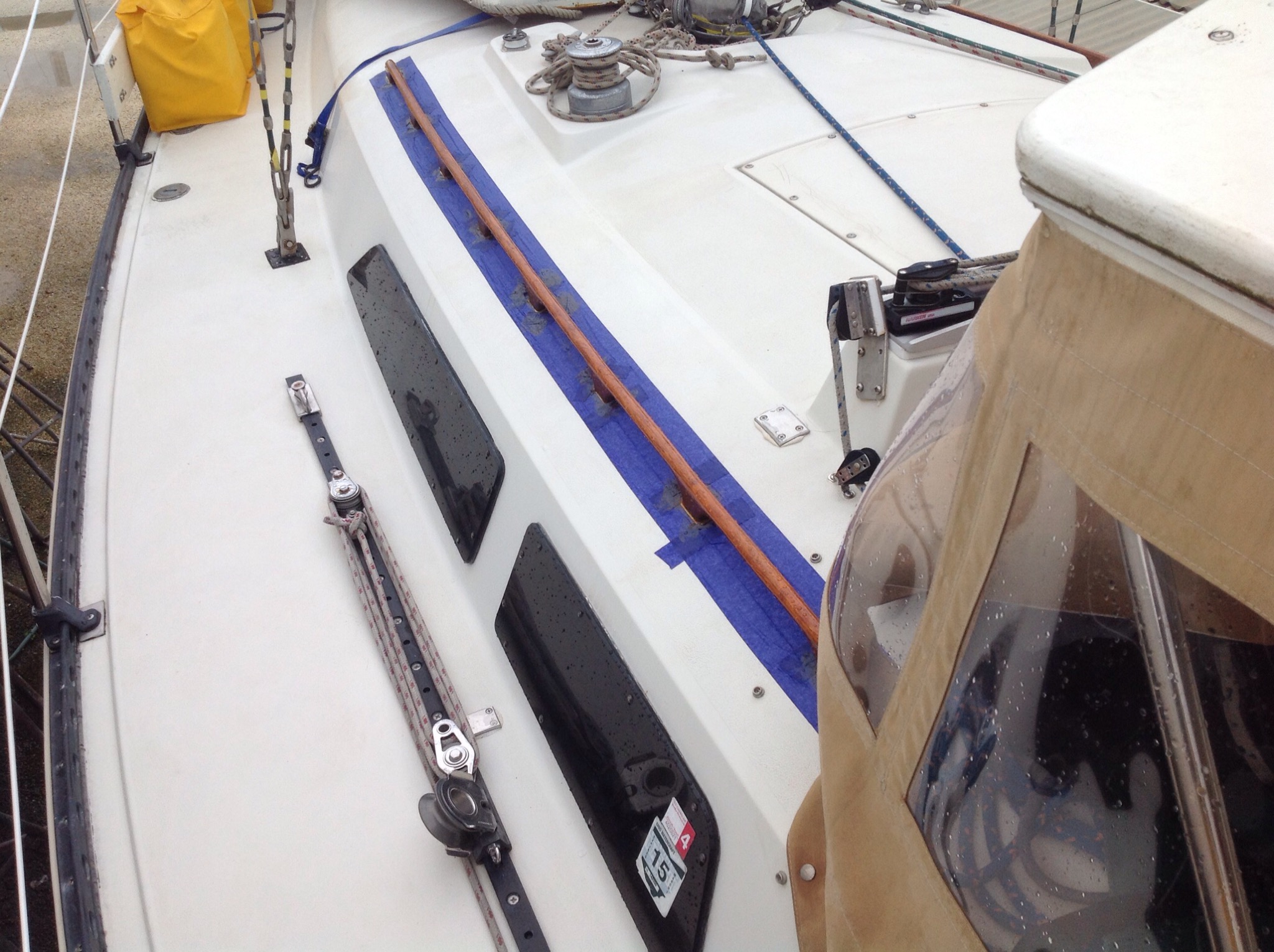 I got up as usual but had a slow start to the day. I just didn’t have the go power to do much. But I got some 100 grit sand paper and started to sand the hand rails. After a while it got easier. Once they were sanded, I masked them off. I did this because I wanted varnish to seal the bottom of the hand rail where it meets the fiberglass of the cabin top. I put on two coats before noon. Then it started to rain.