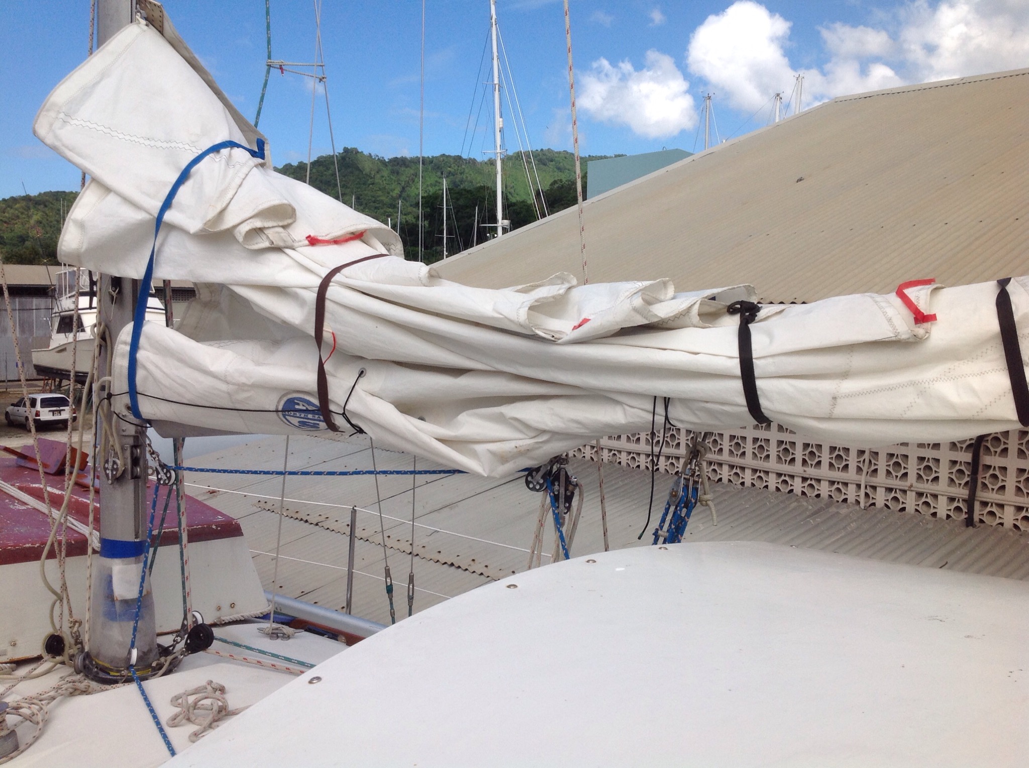 First thing after coffee was to put varnish on the teak parts hoping they would be ready after lunch. The next project was to put the main sail on with all the battens. Also when I put the main sail on I put in the first reef. We always sail with a reef. It makes it easier for Lorraine and I to handle the boat. I then put the sail cover on.