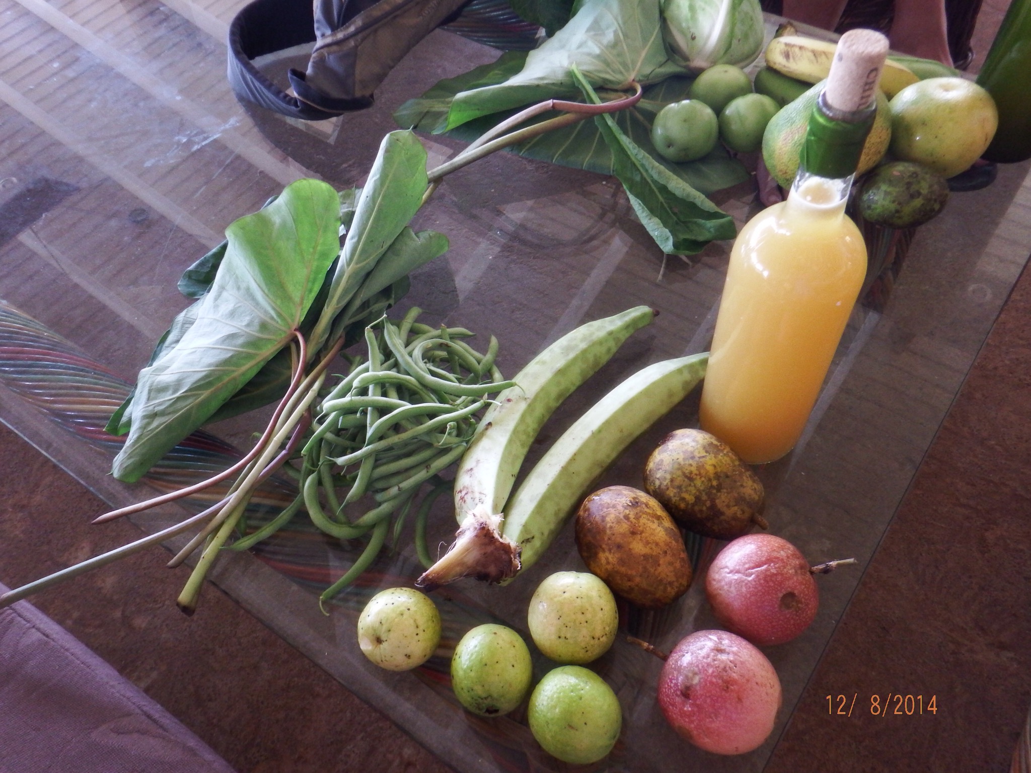 So we got a 20min late start to the market, but walked there through the shortcut Inga showed us and arrived at the right time helping Jenny unload her SUV. I purchased Balloloo, guava, passion Fruit, golden Apples and golden Apple juice, plantains and green Beans. Phil’s not sure of the tropical veggies and fruits so have the green beans for him. Here is the photo, but also added a green golden apple and freshly dug ginger.