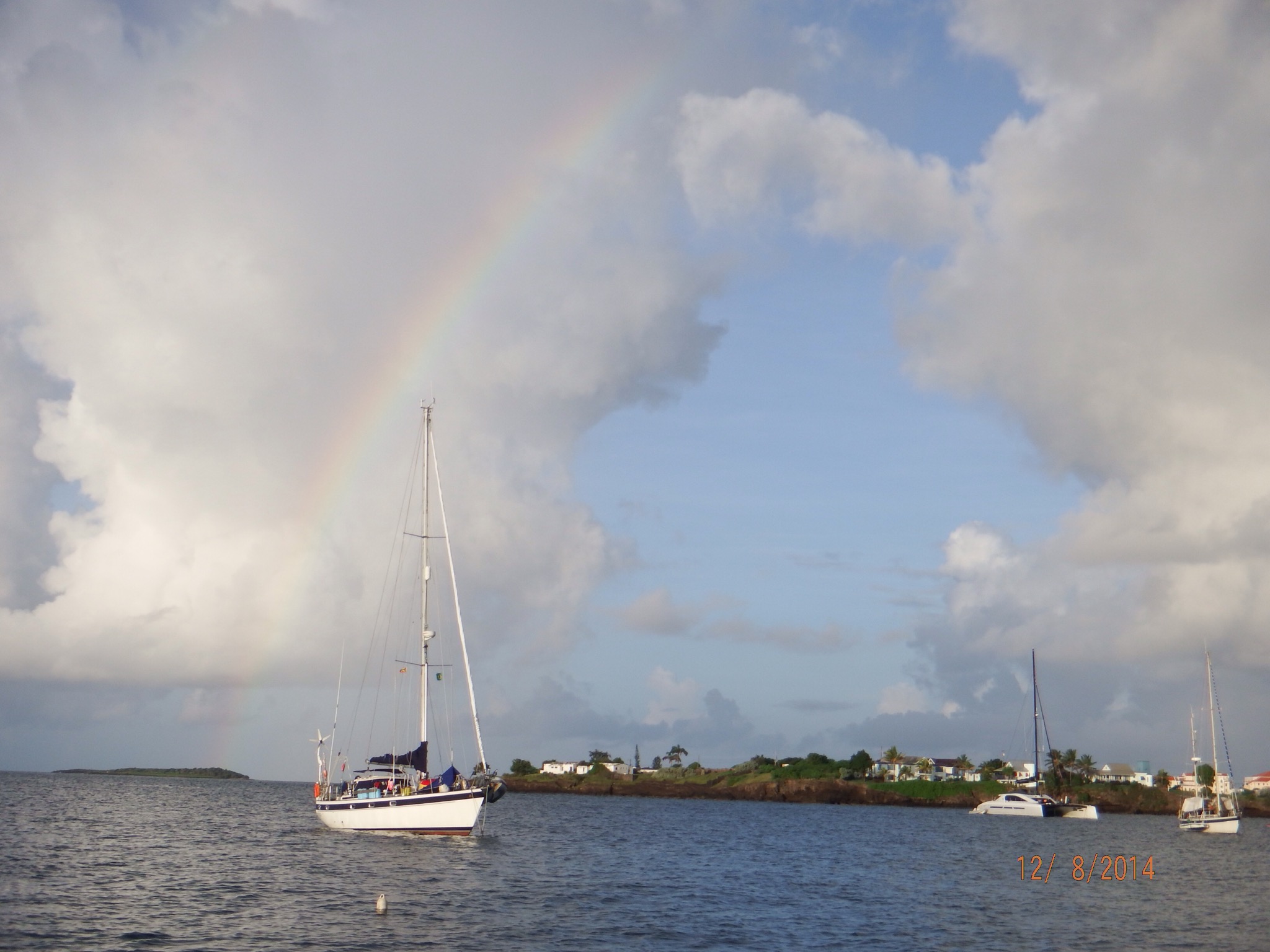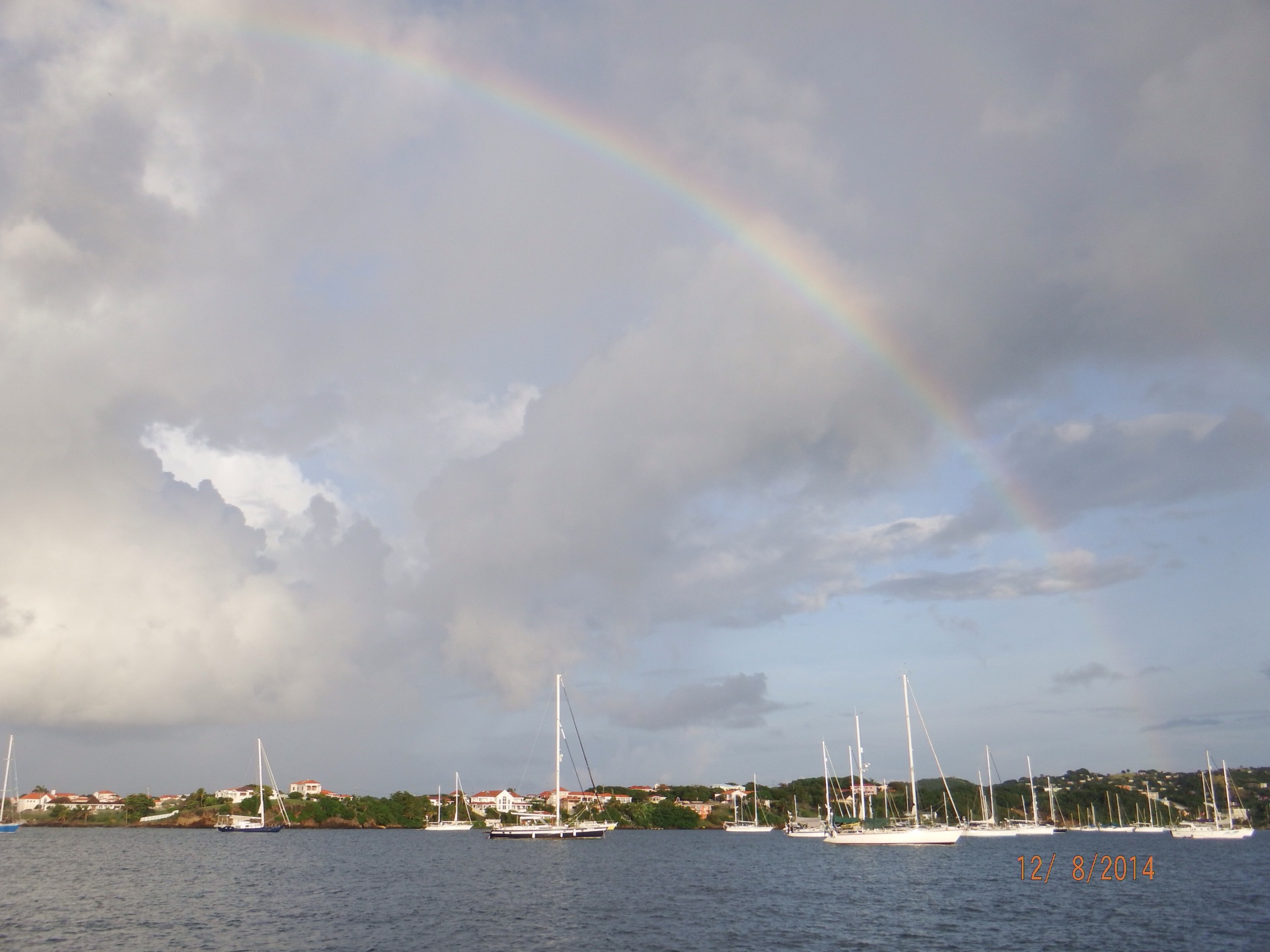 We had some rain showers last night that were just enough for Phil to close the hatch and me to put up the side panels and close the dodger window—and then stop. After a while we opened the forward hatch, and kept the fan on. Early this morning, after a few more rain showers, we had a rainbow across the anchorage.