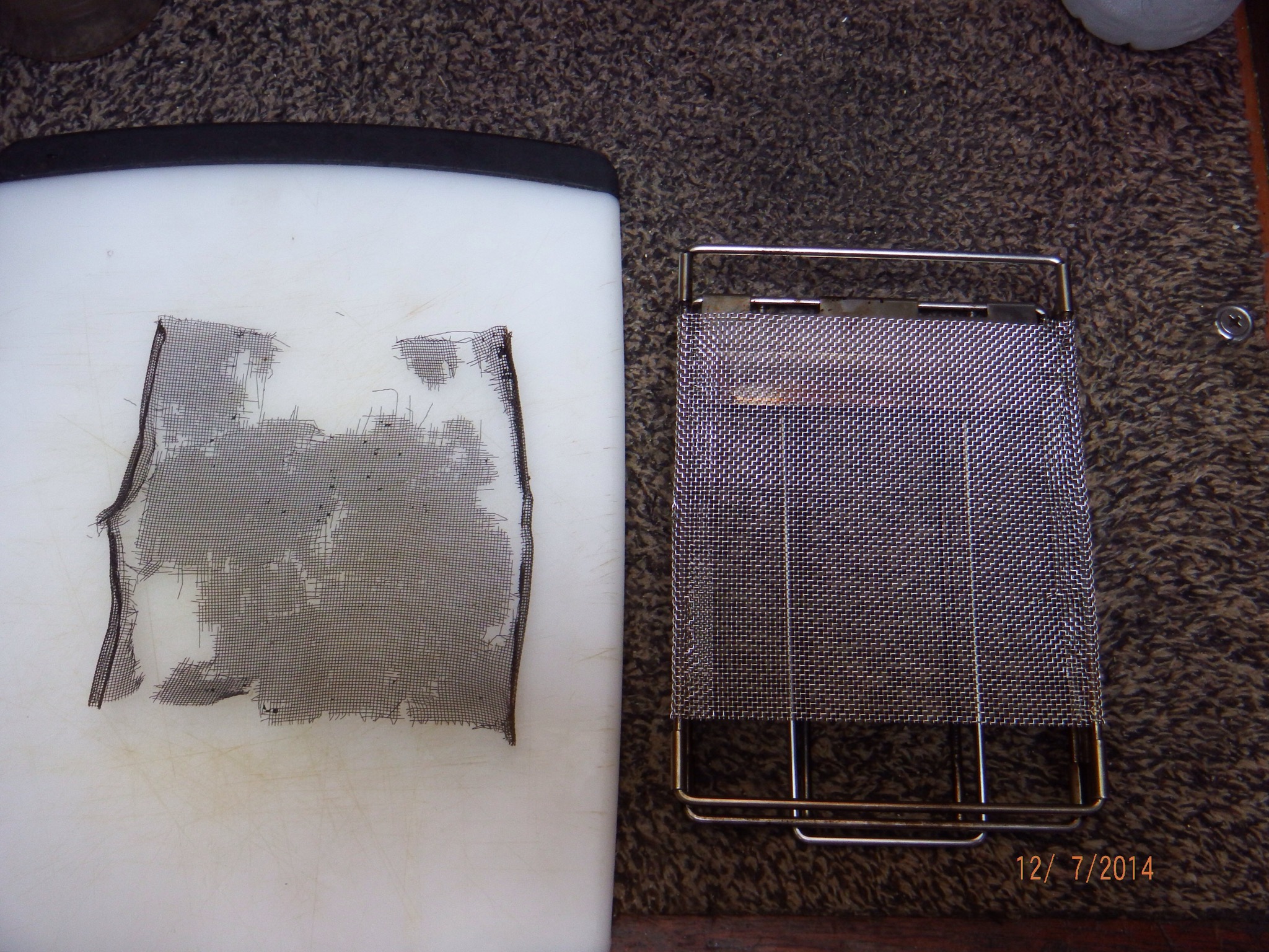 I forgot to tell you how we put a new screen in our toaster yesterday. I cut the fuel screen along the welded edge and opened it up. Then removed the old screen. Phil crimped it on with pliers and you can see from the photo that it looks good as new!