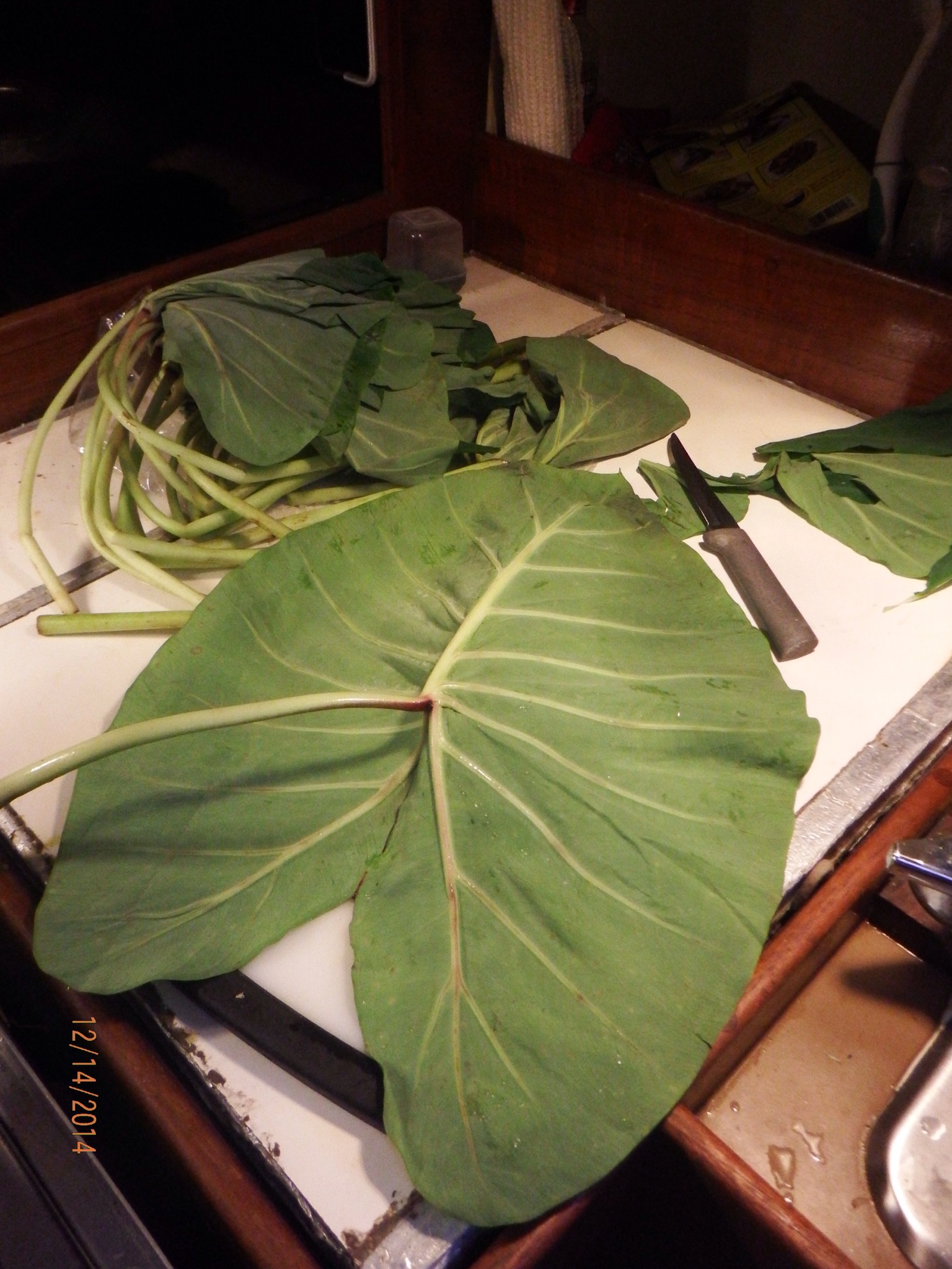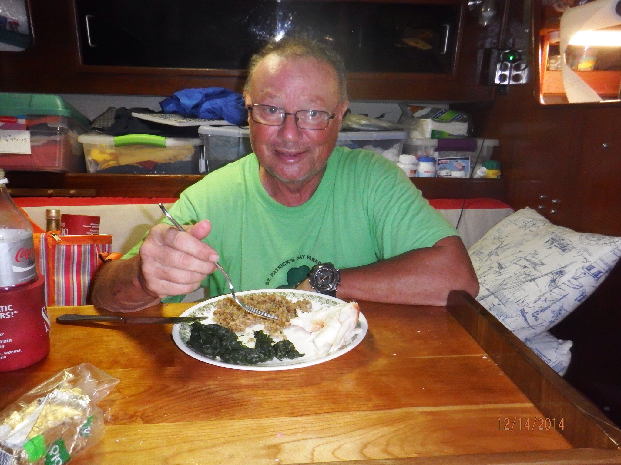 By 345 we were back to the boat when local boat boys came up and asked us if we wanted to buy some lobster. So we splurged and said yes and it was 20 EC per pound in the boat boy said the lobsters 4 pounds each. When the boat boys came back with the lobsters instead of being four pounds it looked to me that it was barely 2 pound but we pay them the $80EC and then I started cooking it. I cooked the Callaloo and made fried rice.