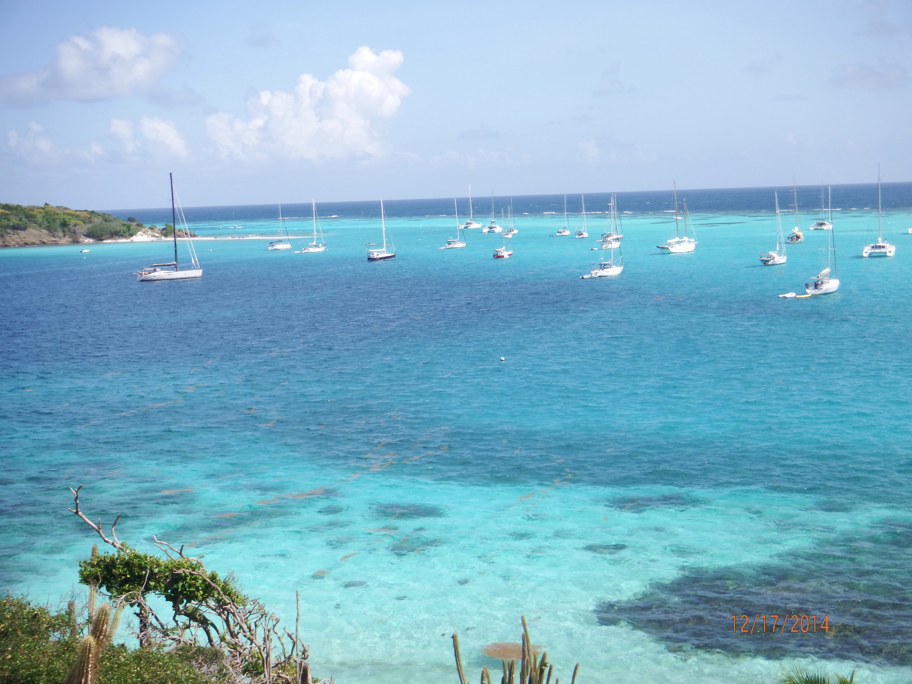 We were off to the Tobago Cays this morning. We only had about five miles to go so we took our time. We had breakfast and listened to Chris Parker’s weather. We left about 8:40AM with the mainsail up. We motored around the end of the reef at Clifton and set a course of 45degrees to the entrance to the anchorage behind the reef at the Tobago Cays. We motor sailed with a wind angle of only 10 to 20 degrees. We were only doing 5 knots or less for the short trip. Once in the anchorage we spotted Vision Quest and anchored next to them. We were protected by a reef and looking east it is just water. This type of anchorage is my first experience with being protected from the waves by a reef. It is a strange experience. We were anchored at 9:42am.