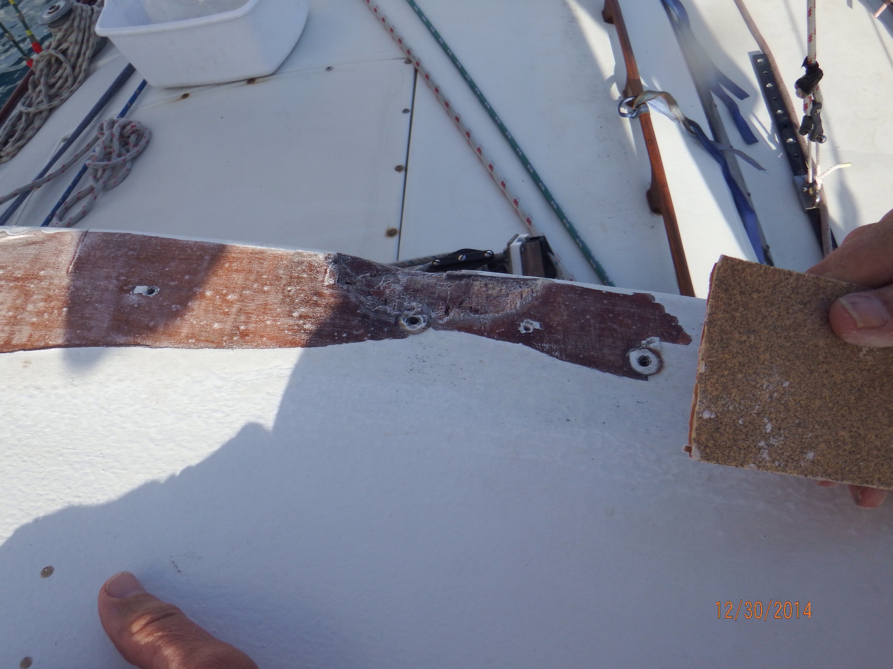 The hard bimini had a section of rot and de lamination on the starboard front edge where it’s screwed into the tubing. I had removed the paint and epoxy to let it dry out earlier so it was now ready to be sanded. After it was sanded, I mixed a batch of West epoxy and liberally coated the area. This binimi is made of interior luan plywood but should be B C exterior 1/4 inch, the same as the dingy. It would have held up better.