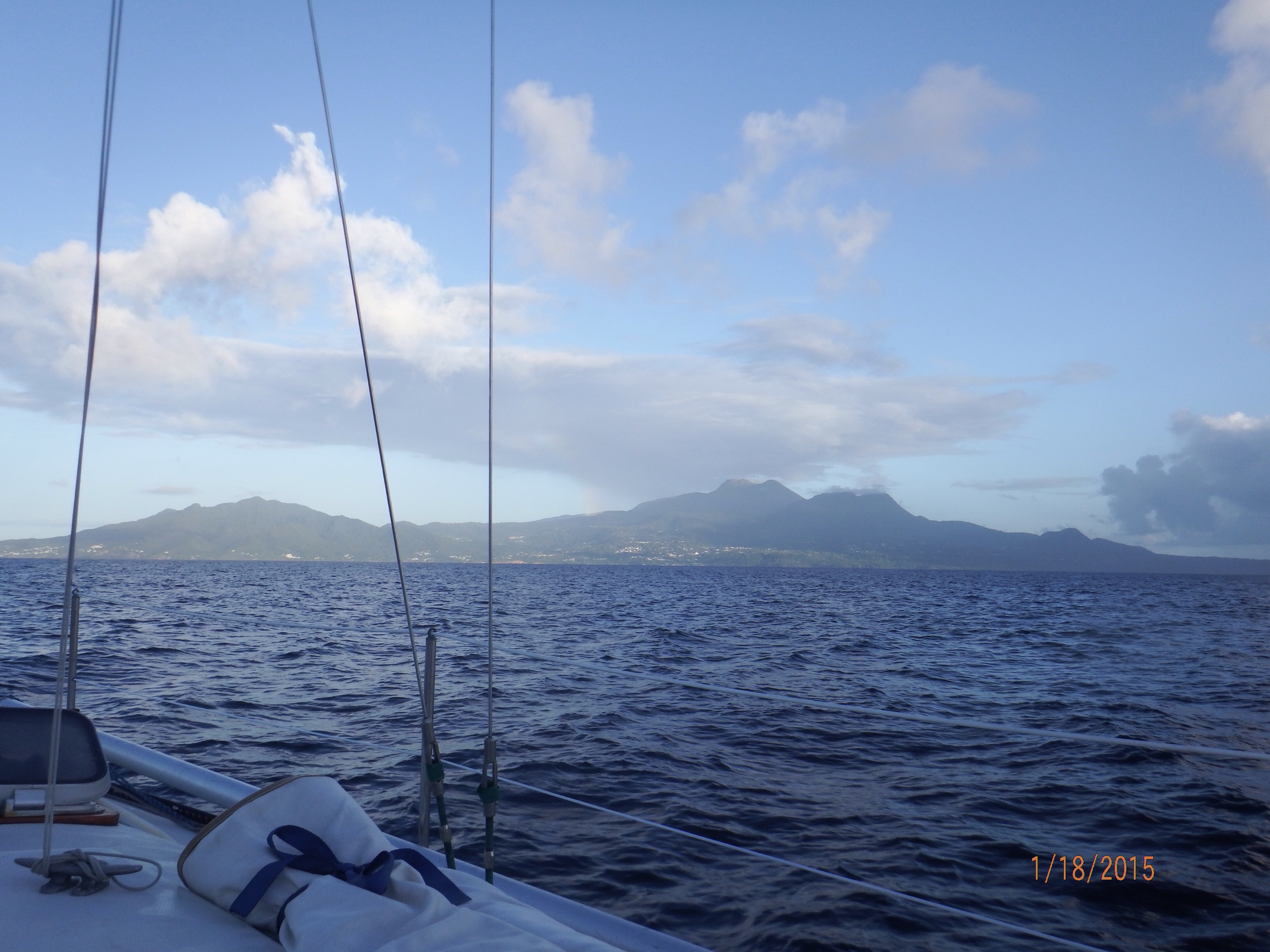 Phil will talk about the sailing trip. Once the anchor was up we motor sailed west toward Diamond Rock 12 miles away. There was a good breeze so out came the jib and the engine went to idle. Around 7 the engine was turned off and we sailed the rest of the way to Diamond Rock. Once we rounded the SW corner of Martinique the wind died so on went the engine. As we motor sailed north we came to the bay where Fort De France is and started to sail again. After we got north of the bay we motor sailed the rest of the way to St. Pierre.