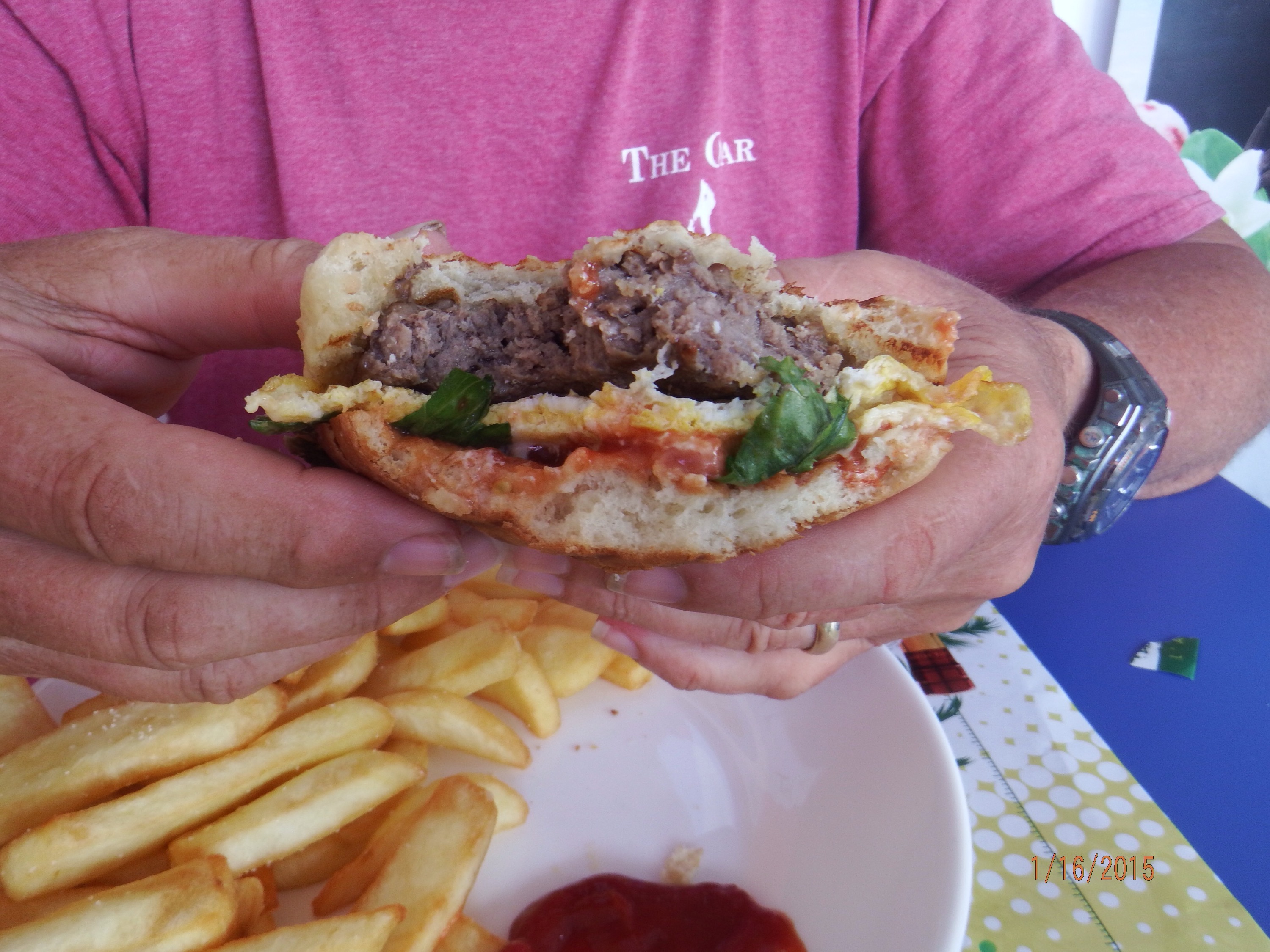 Phil had his standard burger and french fries, this one served with a fried egg in top. I had a thin crust ham, mushroom and cheese pizza which was much bigger than I expected for 8€ for 8 slices about 14″ in diameter. We took home 6 slices so will be good for breakfast or lunch.