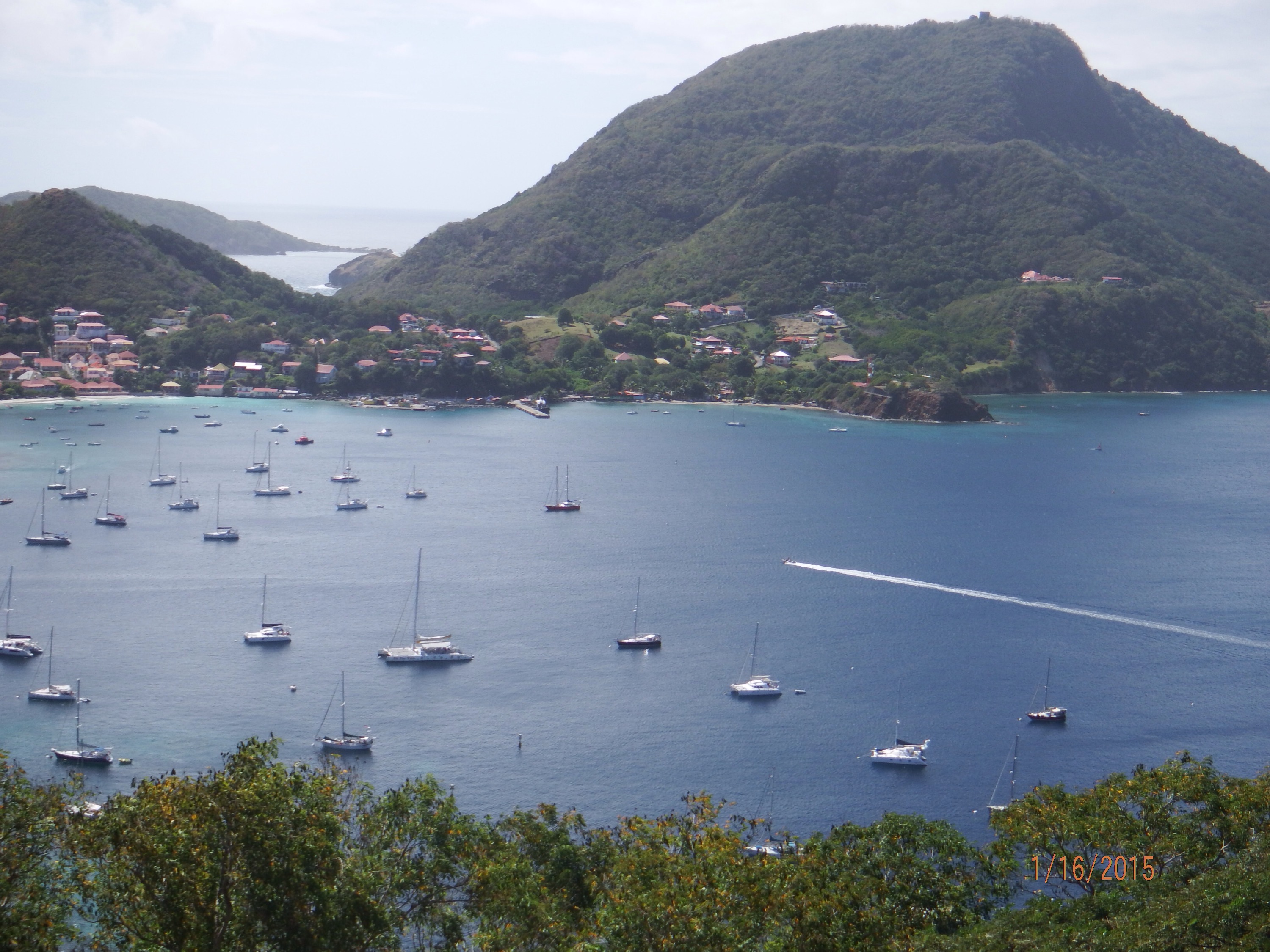 Today with Rick, Peggy, Bob and Jeanne, John and Peggy from SV Want To, we rented a taxi for 10€each to tour the small French island of Les Saintes. It’s about 8 miles south of Guadaloupe. We were lucky to have Katalee be our tour guide as she speaks English very well. We went to the south part of the island first and she told us some history of the island then visited Grand Anse beach on the Atlantic side. The waves really come in here strong as there is nothing between here and Africa to break the waves so there is no swimming at this beach.