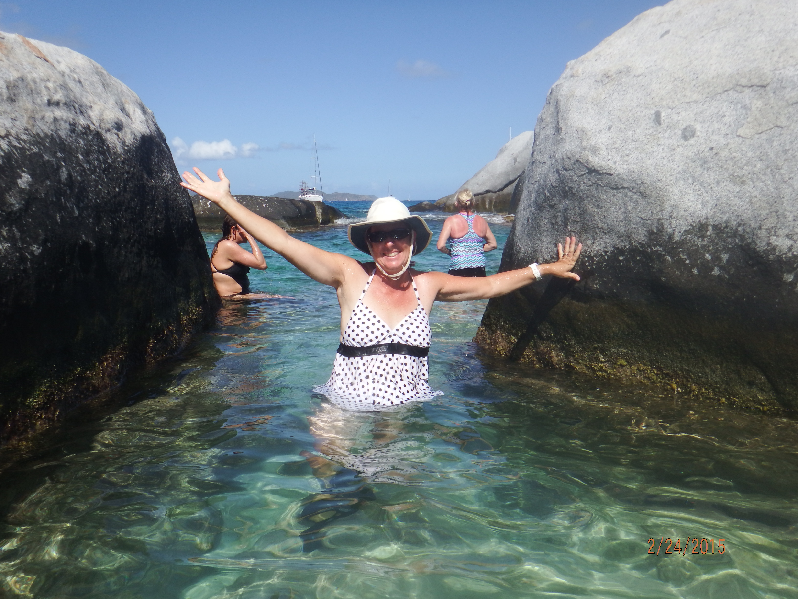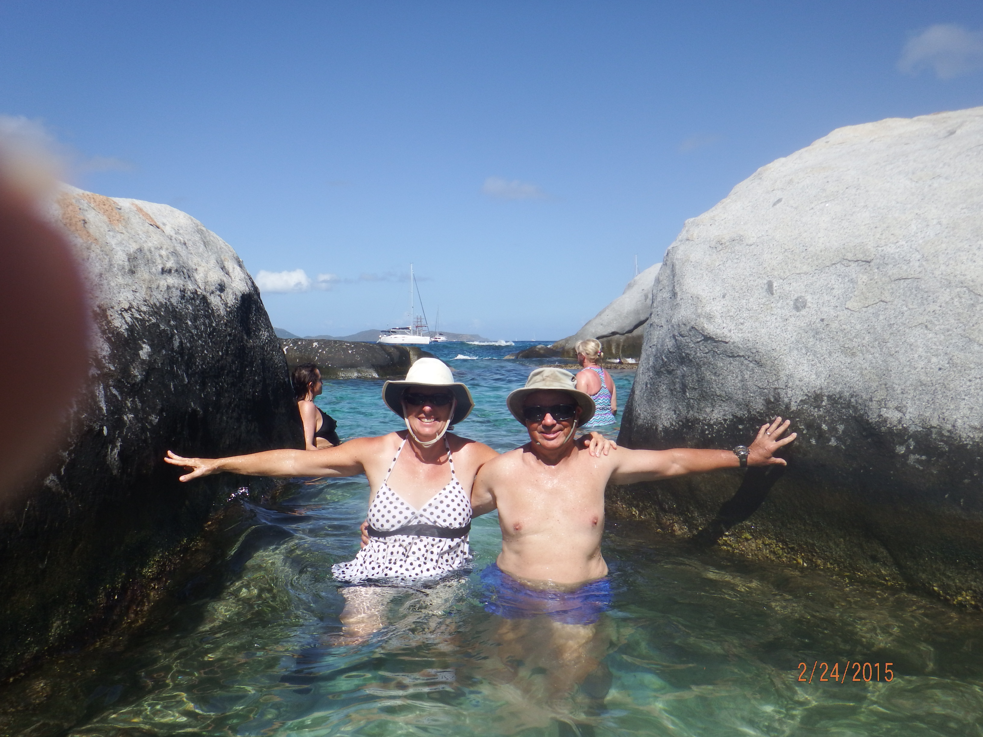 We left Virgin Gorda 731am after Phil had to tighten the Alternator belt from squealing.  We quickly let out the head sail and started towards the channel with the Star Clipper Cruise Ship leaving also towards the same channel  then we had a charter cat motoring and out running the clipper ship.  At first, Phil was trying to outrun the cruise ship too!! but then he powered back and we went behind.  We probably  could have made it through ok, but I was relieved when he decided to slow down.    We initially had the Baberhaul on the jib, but quickly after exiting the harbor we had to remove it to jibe.  Then at 831am we turned off the engine and was sailing initially at 3-10 kts with Gust to 16, then it steadied down to 6-8 kits with gusts to 15 kts.  by 9am we started the enging getting close to the baths so we could roll in the Head sail and pick up a mooring ball by 914am with 27ft water under the keel.   We traveled 8.3nm to the Baths.  Quickly (well as quickly as I can which I have to admit is NOT as fast as Phil would like, I got in my bathing suit and got a life jacket as it’s quite a distance for me being a weak swimmer to go from where we tie the dinghy to the lines on buoys to where you swim into the beach.   Phil was here years ago in 1987 with the consulting group who did a job for Taylor Instruments hired by Combustion Engineering, but this didn’t look familiar to him.  There were many people coming into the beach as a charter boat had more than 20 people with yellow plastic life jackets on.