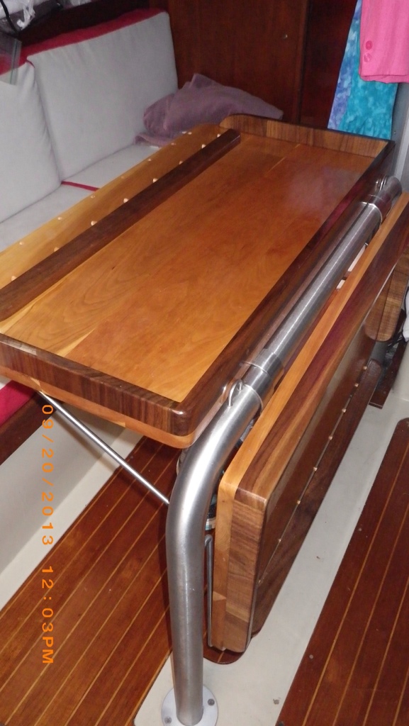 Phil has also made a new table for our salon with removable fiddle, so when playing cards or just eating supper, we don’t have the pressure from the edge of the fiddle on our arms.