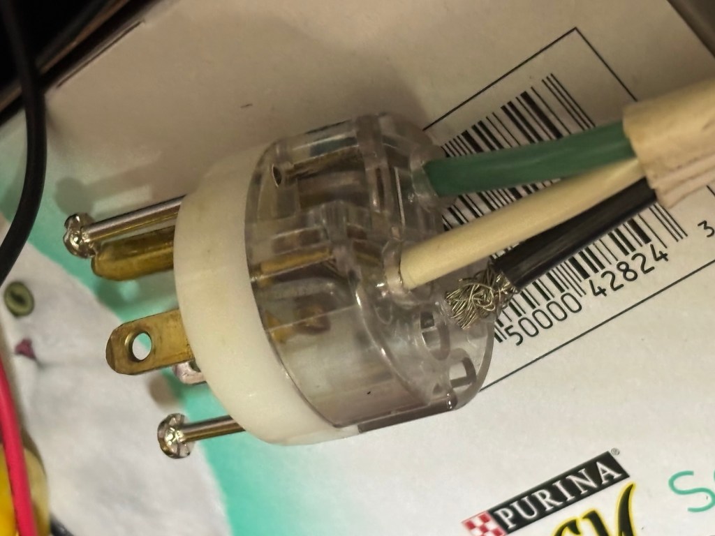 Phil started working in the battery charger starting with the plug to the 115V outlet. After taking it apart, he found something interesting.