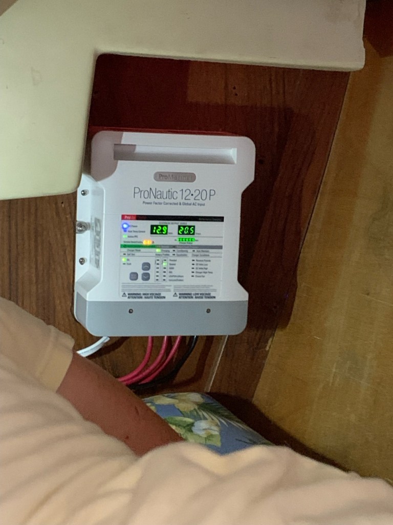 George was right to take apart this plug. Phil fixed this, then had to reconnect the black and white wires to the starter. Then we flipped the switch for the battery charger and hallelujah it turned on.