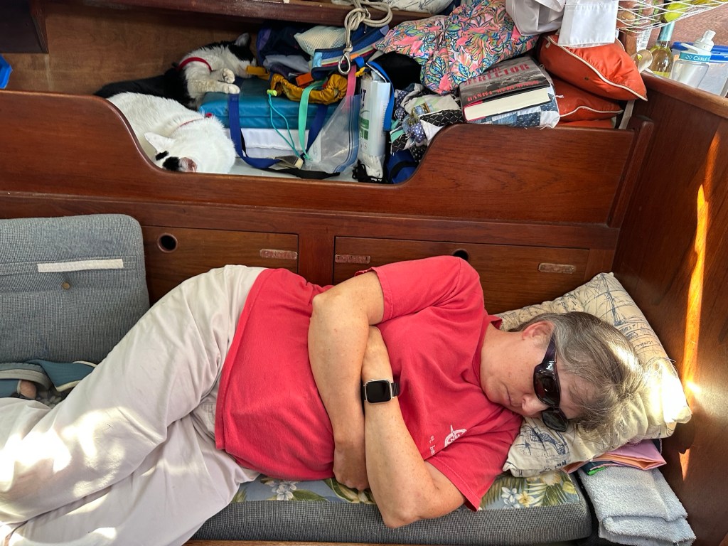It wasn’t too much past the Nuclear power plant that we heard a bang and then the backstay was loose and then we looked forward saw the rolling furling jib forestay had come off its connector and was flapping around on the deck. Phil and I were able to grab it and get it under control. Phil turned the boat around 180° so that we were going downwind calming the motion of the boat, Vicky came up from her bunk and assisted us. Being on the bow, I quickly became sea sick and after a while, I had to go back to the cockpit. We still had the pin and Phil was able to get the forestay connected with Vicky’s help and a curved cotter pin in to secure it. Phil tried to replace the curved pin with a straight pin, but the hole was too small. Phil and I tightened the back stay, turned the boat back on course and continued on our way. Unfortunately, my seasickness got worse and I pitched it (vomited) over the side. After that I felt better and not too long went down for a nap.