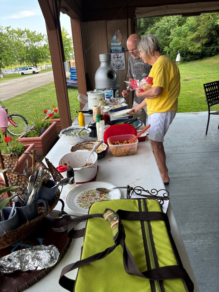 We enjoyed talking with Jerry Persily of SV Manganinne, a C&C 38’ sailboat. We also met Ann Hysell who has her own Tartan 37. She’s also an RN caring for her mom. We have decided to stay another day for the Seaglass Beach Festival. Then after Ann has done her parking duty, she wants to come see our boat. Potluck was delicious.