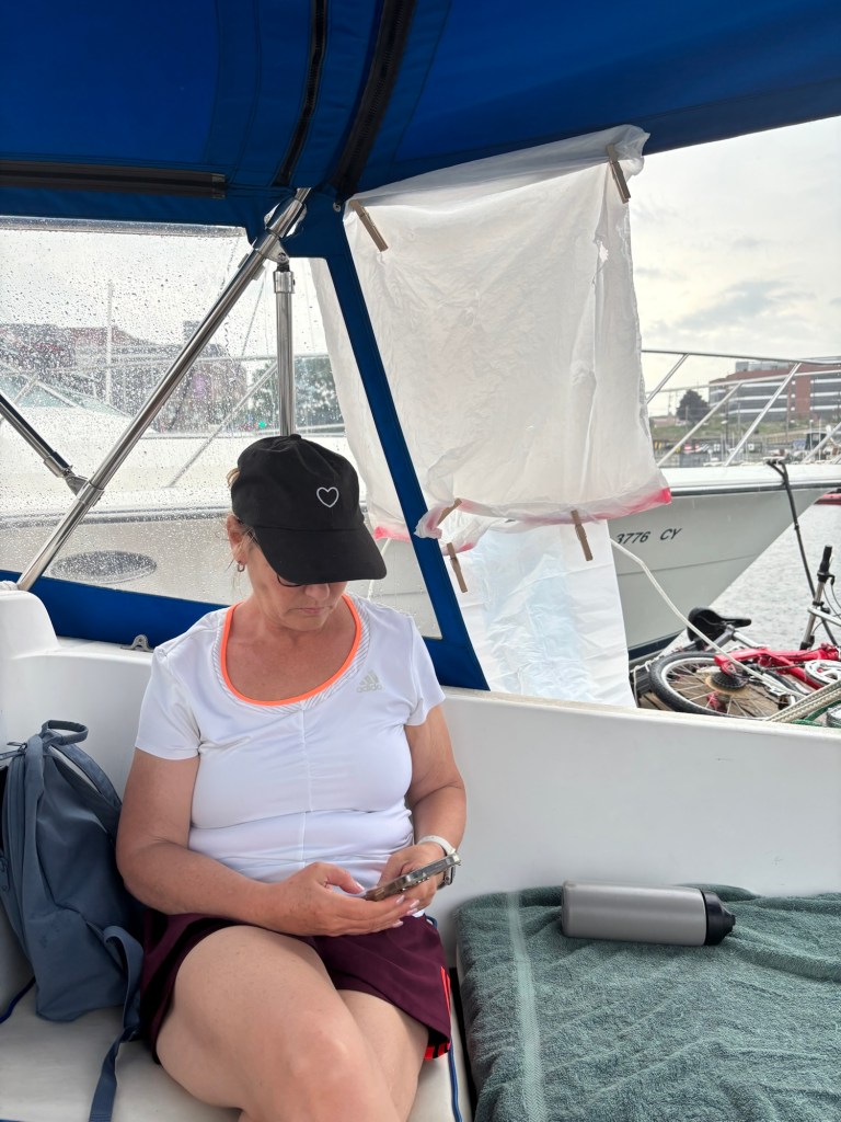 After we got back we both took a nap. It was raining lightly on and off in the afternoon. Most of the red cells went not and south of us. I went to the marina office to get 2 bags of ice and the rain started coming down heavy. I made it back to the boat before it was a deluge. Turns out Phil used the marina bathrooms and had to wait until the rain stopped to get back to the boat. I made ham and turkey sandwiches for Phil and I, yogurt with fruit and blueberry powder.