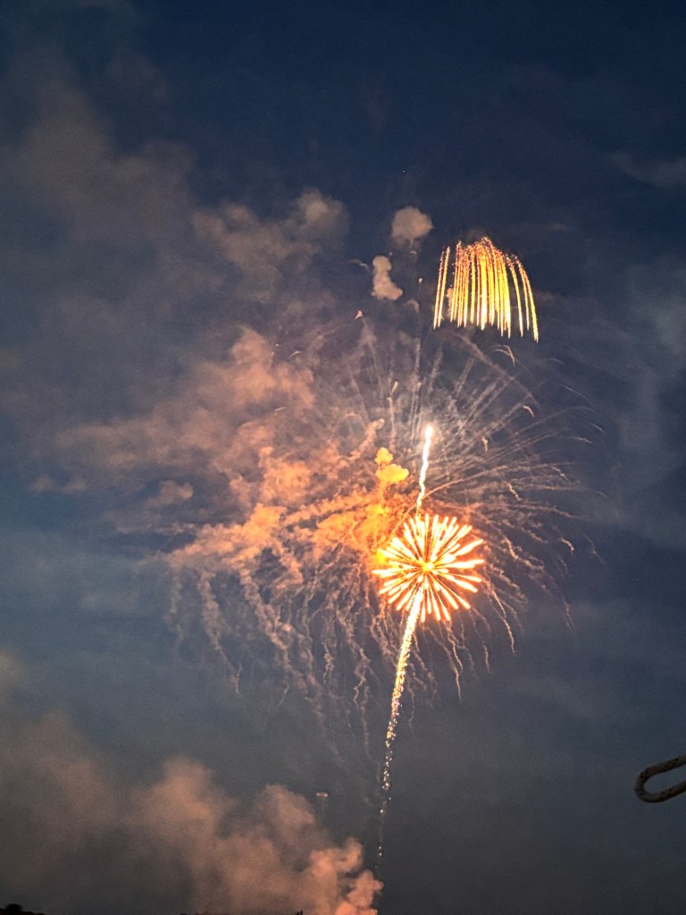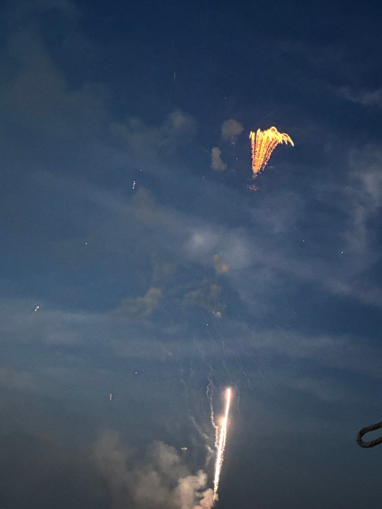 Phil and I hung out on the boat while Vicki went with friends to Bart’s Cove bar and other places. She returned in plenty of time for the fireworks that started at 930pm and lasted 30 minutes. Bill and co-owner Pat and I think her grandkids were next door to watch the fireworks and his young friend really got into July 4th,