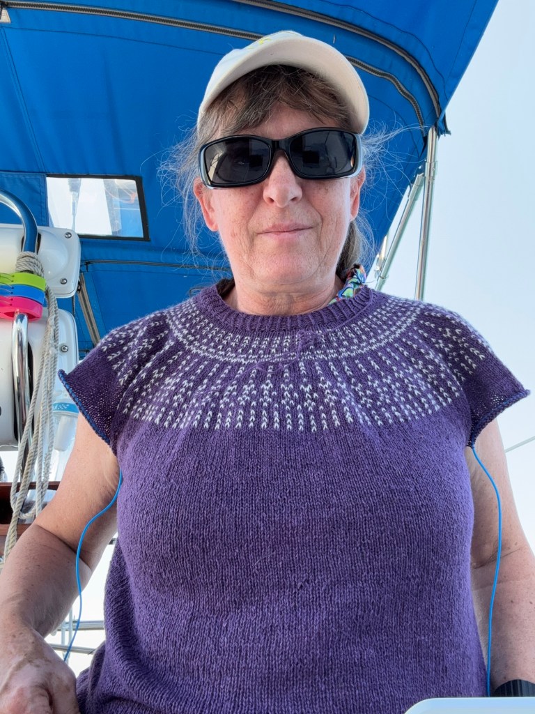 About 5 o’clock I went back to the boat and listen to the second rock band, which was better than the first band. I started knitting on my quilt top again, working on the body ribbing at the bottom. they have a Picot bind off and I was able to get that part done.  Next is to finish the sleeves, which I’ll do the picot bind off on. Then wash and block and wear.