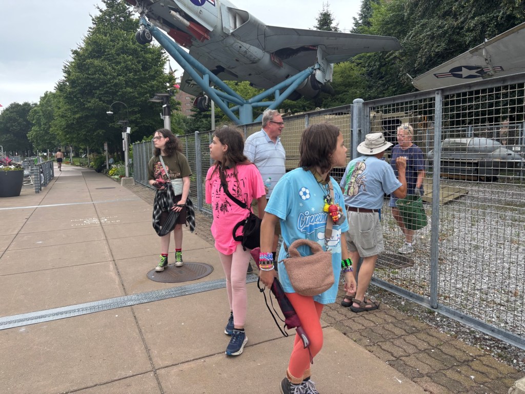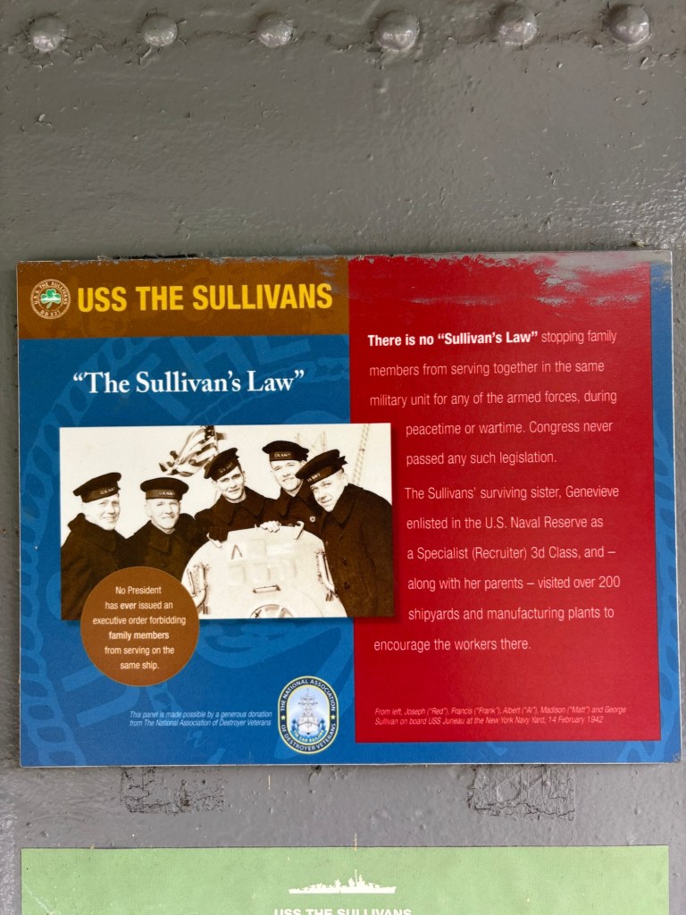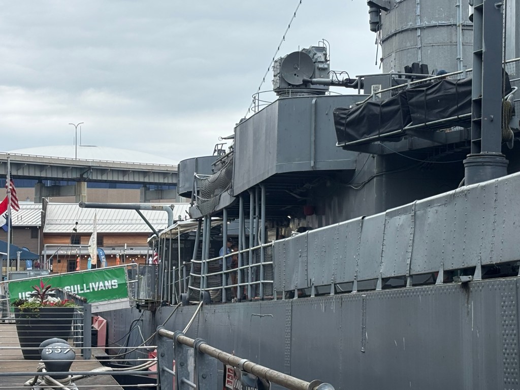 Family visiting: Glenn and his daughters Lauren, Riley and Teagan arrived about 8:30 AM. The girls immediately gave some love to both Casper and Lucy. The girls had gotten up at 4 AM. Teagan said and she was hungry so she had a bowl of granola and all the visitors had a bottle of cold water as they had had a long trip and walking to get to us at the boat. Our plan today was to go down to the Naval Park and go inside the naval World War II ships that are at dock in the Buffalo River. First, we went on naval ship the Sullivan’s named after the five sons who died all at the same time on a naval ship in 1942. they have a tour guide to give you an idea of where to go, but it was a self-guided tour and very interesting. Then we went on the naval destroyer the Little Rock. This is a ship that that has overnights on board for kids so they had mats on the bunks and the mess hall and the galley were set up for people to eat there. They also had museum exhibit on the second and third deck down in the mess hall, they had a video playing about the atomic bombs and the hydrogen bombs which Phil found very interesting.