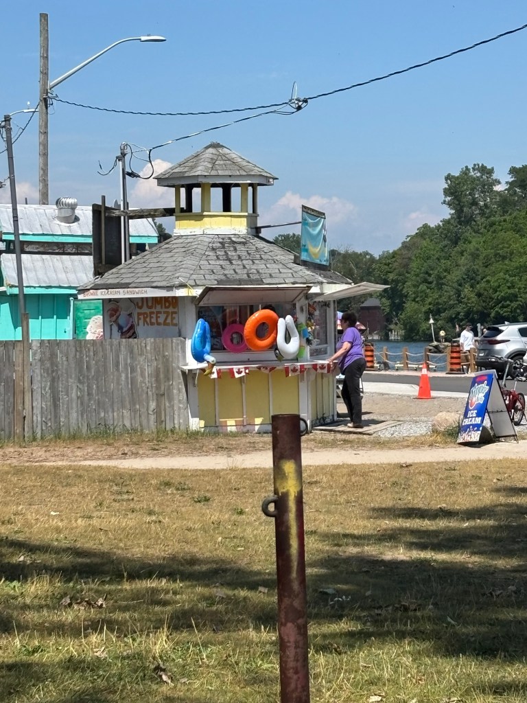 After lunch, we rode up the long hill on Main Street and found a apothecary we were able to get Phil‘s allergy medicine there rode to the end of the area where they had the shops and stores and turned around coming back on the other side of the street. I passed a pet supply store, hoping to get new filters for the cats water fountain and they didn’t have any, but I did find some cat nail clippers to use on on Casper claws. He hasn’t really been using the scratching pad on the mask and they are getting too long by this time. It was 3 o’clock and we rode down towards the end of the channel and found an ice cream stand there and of course we got ice cream. I got maple nut and Phil got butterscotch swirl.