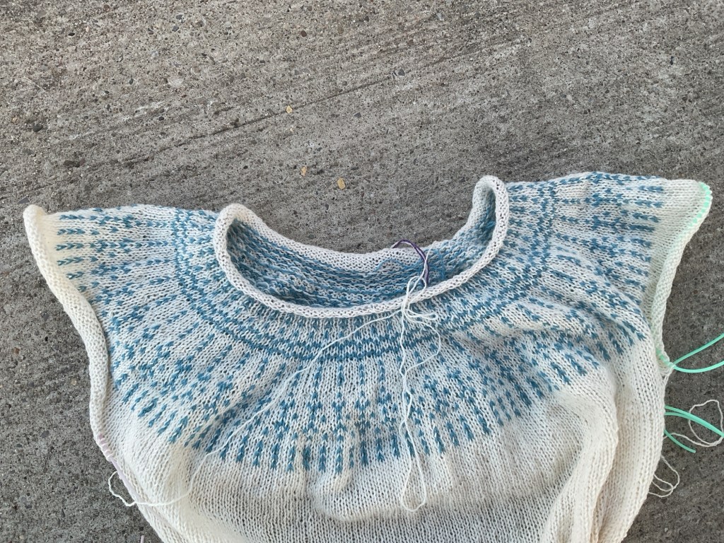 I’ve been knitting as long as the weather is not too hot while visiting with club members in our area. I got all the yoke color work finished so now we’ll be starting on the main color which is ecru. Now I knit for 1.5” in the round and separate for the sleeves.