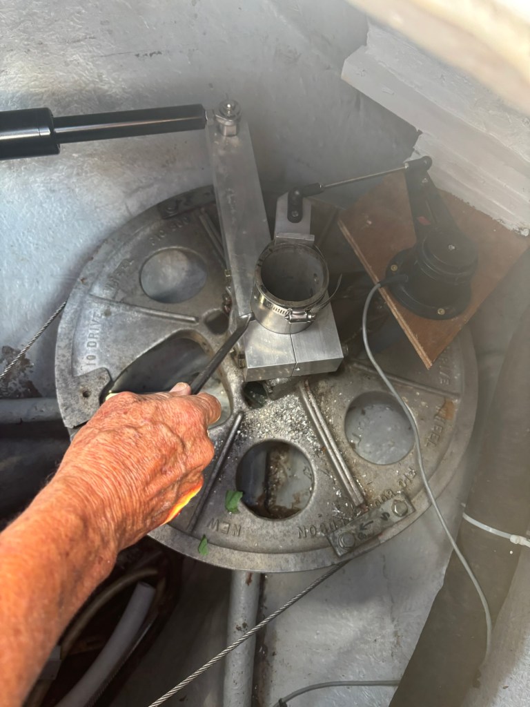 The next boat project was to check out and fix the groan the steering wheel made under rudder pressure and the autopilot slipping which gave us a rudder error message and why we hand steered yesterday. Phil told me the groaning noise and the autopilot slipping were both caused by slipping where the tiller arm connects to the rudder post..