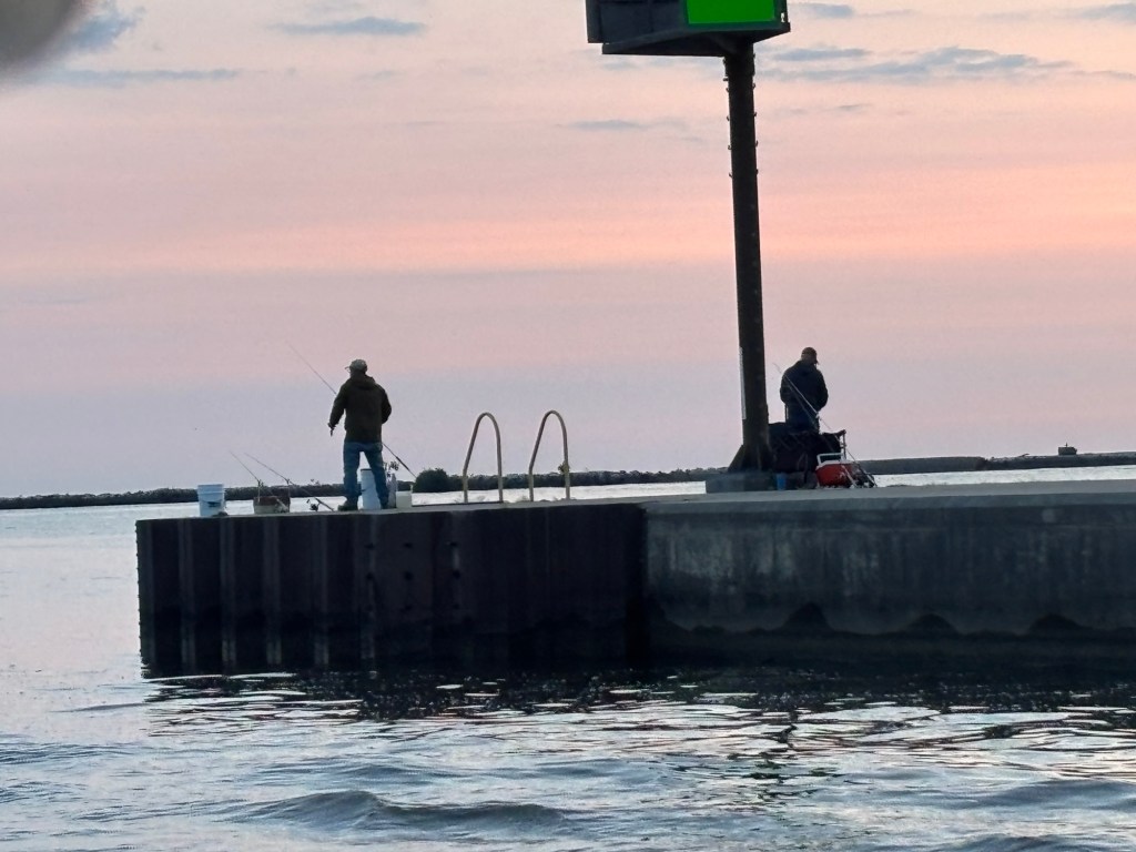 Fishermen on end of pier Fairport harbor, end of Grand River, Ohio